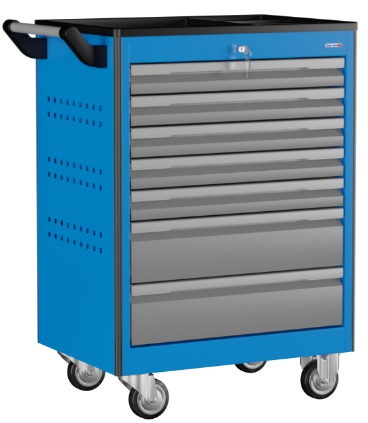Цвет и текстура покрытия корпуса тележки RAL 5015 (синий) полуматовая. Цвет и текстура покрытия ящиков тележки RAL 7037 (серый), глянцевая. Цвет и текстура покрытия накладок на ящики RAL 9006 (серый), глянцевая.